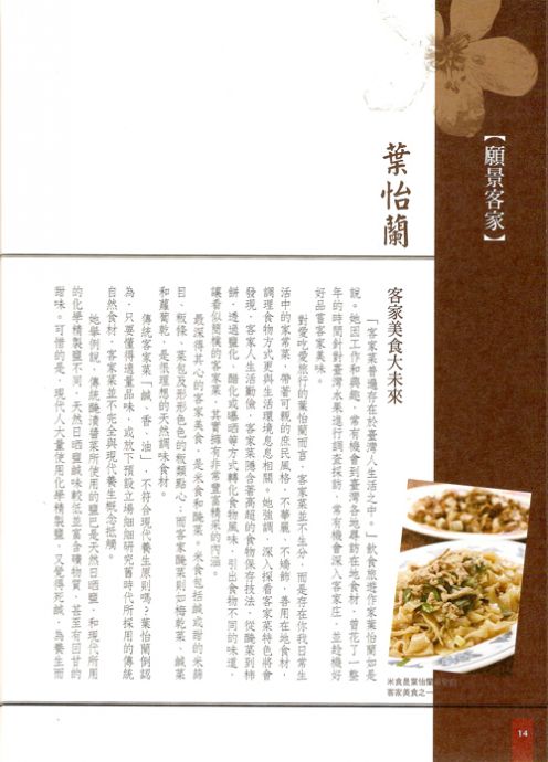 「客家菜普遍存在於臺灣人生活之中。」飲食旅遊作家葉怡蘭如是說。她因工作和興趣,常有機會到臺灣各地尋訪在地食材,曾花了一整年的時間針對臺灣水果進行調查採訪,常有機會深入客家庄,並趁機好好品嘗客家美味……