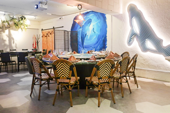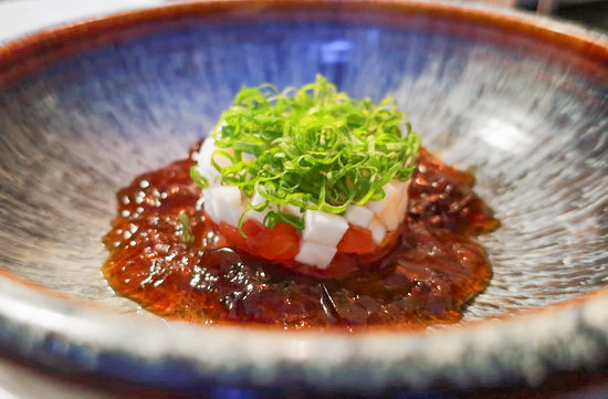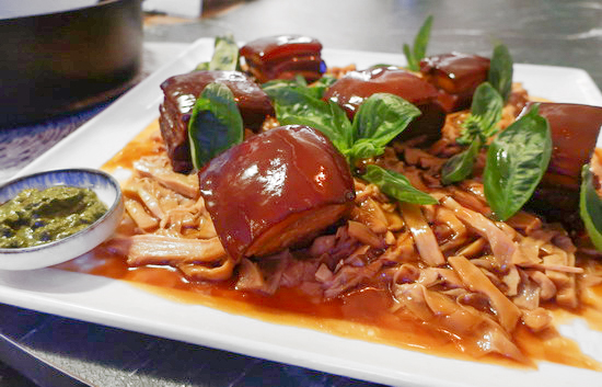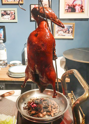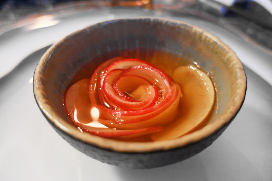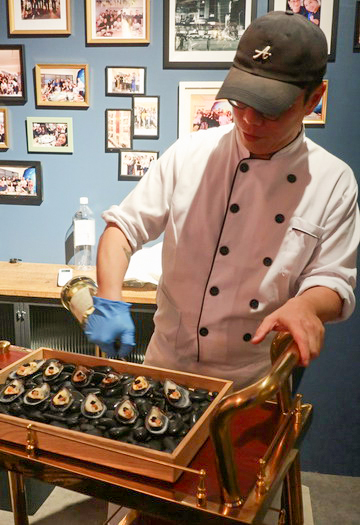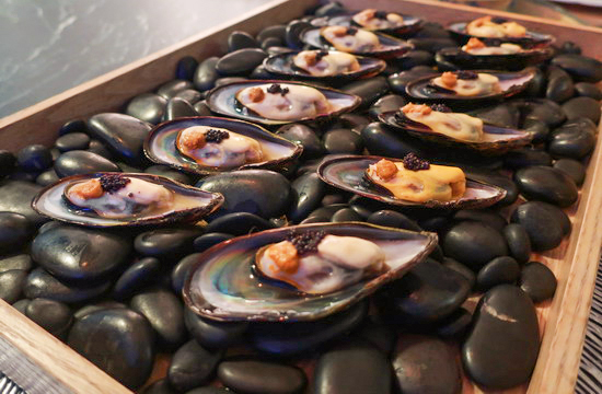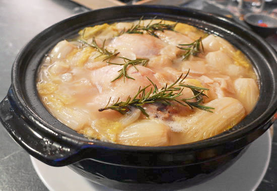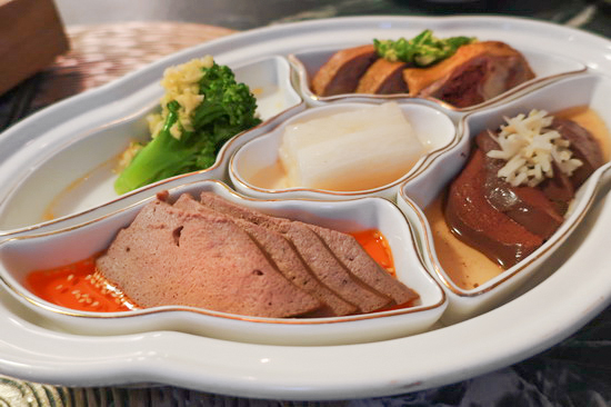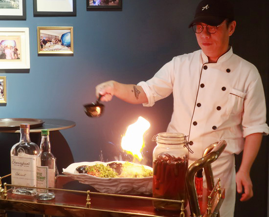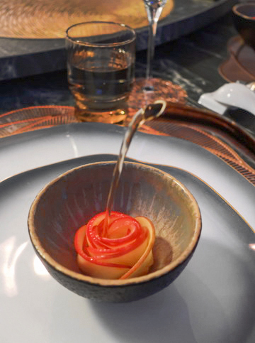 | 私廚風潮持續火熱,四方各路紛紛奮勇加入行列,而一眾新軍中,五星級飯店血統的「廖家宴」可謂從背景到料理均獨樹一幟的一家。 立地位置有些微妙……隱於酒類專賣店後,還蠻有幾分 Speakeasy 氣氛。菜色承襲華國飯店的既有中菜基礎,遂如潮式滷水、烤鴨、剁椒魚頭、東坡肉等扎實功夫菜都是主打,卻又加入老闆夫婦的私房創想,些許點染西式調味與手法: 比方吻仔魚紅鳳菜配蒜酥和法式白醬、東坡肉配義式羅勒青醬、桂丁雞湯上桌前趁熱扔幾葉迷迭香,都為傳統菜式多點染了幾分豐富活潑味道。 華國素來聞名的烤鴨,在此多了一道龍眼木煙燻,剁椒魚頭則當堂淋琴酒與伏特加炙燒,美味生香,意趣滿滿。 |