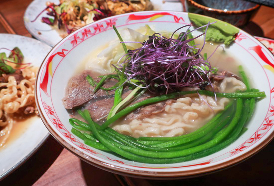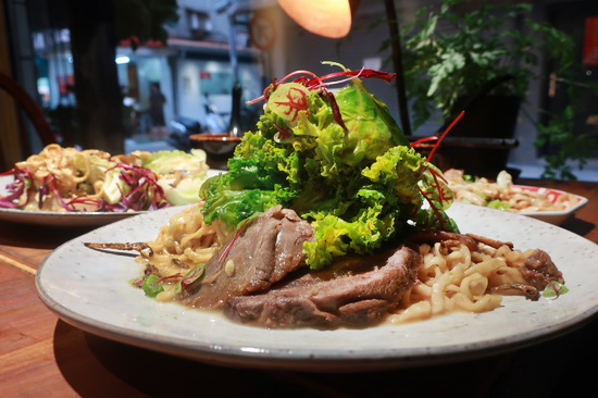 | 活動後就近覓食的偶然邂逅。從形式到菜餚皆獨樹一幟,菜單隨四季輪換,麵與飯為主體,卻從素材到組合都別見巧思紛呈多端。 印象深刻是他的柚子胡椒清燉牛肉湯麵,湯清味足麵彈勁,習習柚子胡椒的辛香果氣與多量蔬菜更增芳爽。另道高麗菜苗炒煙燻豆皮也出色,蔬脆菇甘豆皮噴香,鑊氣燻味相交織,美味酣暢。 |