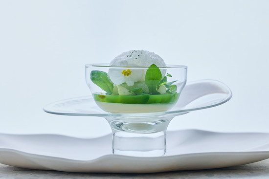 延伸自Béchamel的「Velouté(絲絨醬)」,經典做法是以麵糊與動物高湯創造濃稠感,本 季,Chef Alain 大膽挑戰 0% 澱粉的條件,利用春菊的葉片纖維,純熟地操縱物理質地乳 化,藉由攪打與過濾手法,重塑如絲緞般滑順的口感,盤中主角是鮮嫩綿密、口感近乎棉花 糖的春雞舒芙蕾,搭配燴煮(Fricassée)、裸食(Crudité)、與生鮮(Raw)的蔬菜,重 新定義植物飲食與健康的美味高度。