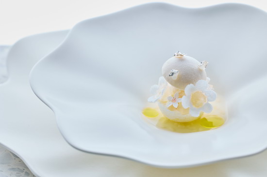 主餐以最能展現深沉風味與厚重質地的「Espagnole(褐醬)」搭配羊肉。褐醬需要仰賴長 時間熬煮烘烤後的牛骨,完成一鍋風味濃郁而且充滿肉香的高湯,然而,Chef Alain 挑戰以 低溫長時間拌炒乾蔥、紅洋蔥與西瓜大根,輔以菌菇取代牛骨,提煉出風味深邃的蔬食鮮 味,完美模擬傳統褐醬的厚實深度,風味卻更加純淨。為了迎接春天,選用日式櫻花醬汁醃 漬澳洲黑面和羊,搭配帶有櫻花地瓜麵疙瘩,打破料理與甜點、東方與西方的界線。