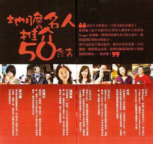 讓7位台灣名人饕客和人氣美食blogger當導遊,帶我們嘗遍台北大街小巷中,獲得他們好評的50間食店。當中包括老字號長龍店、隱世品味私房菜、小吃攤檔、雅致甜品店等,請帶同餓扁扁的肚子和脹鼓鼓的錢包,一起出發!