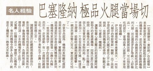 美食兼旅遊作家葉怡蘭談起印象最深刻的機場美食,是在西班牙巴塞隆納機場,「在機場裡的小酒館居然能吃到伊比利火腿,而且還是Bellota等級(上好極品)」……