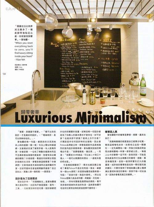 「美食與居家設計結合,是不可抵擋的生活風格趨勢!」葉怡蘭這麼說道。她仍難忘初見法國CONRAN結合餐廳與生活用品商店時的驚豔,也對美國瑪莎史都華風潮、澳洲Donna Hey出美食雜誌和居家器物,有極深的印象……