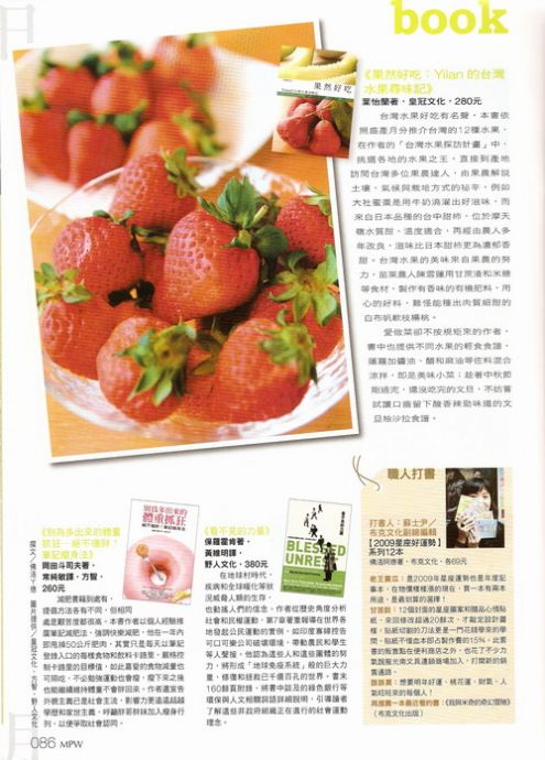 台灣水果好吃有名聲,《果然好吃:Yilan的台灣水果尋味記》依照盛產月分推介台灣的12種水果,在作者的「台灣水果採訪計畫」中,挑選各地的水果之王,直接到產地訪問台灣多位果農達人……
