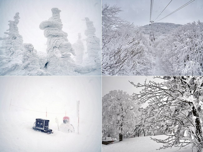 但可能因做足心理準備,倒也並沒有太失望,反覺也算難得體驗。尤其回到樹冰高原駅而後藏王山麓駅,能見度稍有改善,纜車裡雪地上靜望,更是深深驚艷於雪山雪林雪樹雪原之美,成林成片構連交織成黑白靜默無色、卻是無比壯闊華美的輝煌世界,佇立其中,感動震懾無言。