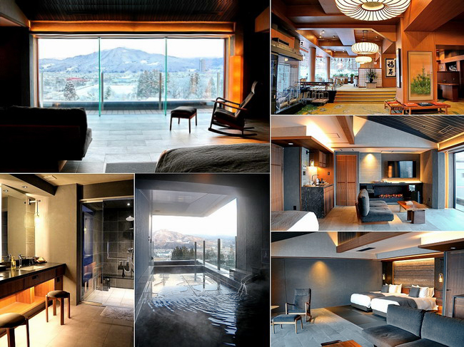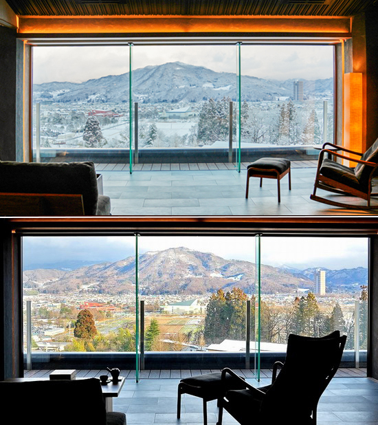 與旅館原本既有客室的一派傳統和風不同,走的是近年日本溫泉旅館界正風行的現代摩登時髦路線,空間與家具陳設線條簡致洗練,色調沉著深灰,搭配從高而下的斜屋頂,將整體視線視覺朝一整長幅高寬落地大窗導引延伸烘托,恢弘壯闊藏王連峰之晨昏日夕風景成為全室當然焦點與主角。