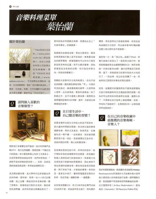 我喜歡的音樂是安靜、單純又簡單的,簡單的東西要能打動人是不容易的。像是霍洛維茲的鋼琴獨奏,那裡頭擁有可以和自己相互對話和思考的位置。我不太聽交響樂,因為那裡面並沒有我的空間,你只能全神貫注地、恭敬地聆聽著它……