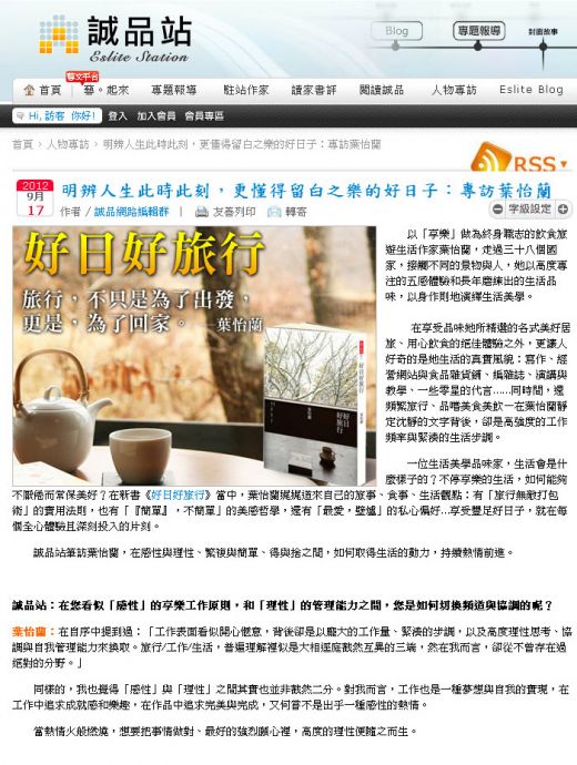 一位生活美學品味家,生活會是什麼樣子的?不停享樂的生活,如何能夠不厭倦而常保美好?在新書《好日好旅行》當中,葉怡蘭娓娓道來自己的旅事、食事、生活觀點:有「旅行無敵打包術」的實用法則,也有「『簡單』,不簡單」的美感哲學,還有「最愛,壁爐」的私心偏好…享受豐足好日子,就在每個全心體驗且深刻投入的片刻……