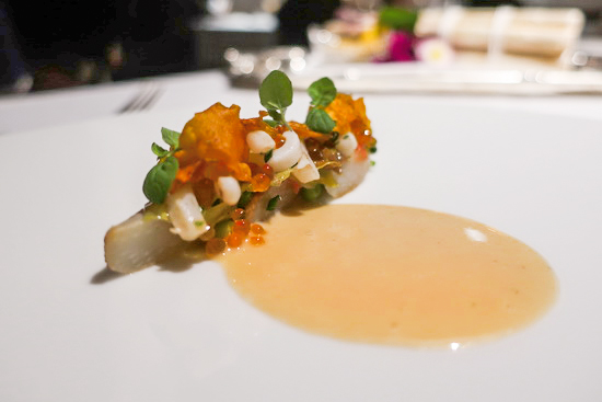 此次春季菜單以花為貫穿,深得我心是前菜的香煎當令白蘆筍,佐以甜豆、鱒魚卵、爆炒透抽、南瓜脆片與桂花起司奶醬,組成並不繁複,卻是花之馨郁、筍之柔甜、海之鮮彈、豆之綿香明亮雅逸層次多端相映照,讓人大呼好想再來一盤。