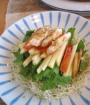 4. 在盤中依序放上苜蓿芽、蔬菜、蘋果、蕃茄與雞肉,均勻淋上豆腐乳醬汁,即成。