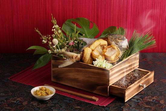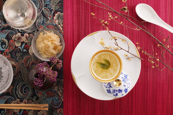 菜單設計以兩個篇章鋪陳,從文化交會到經典重現,串起大正時代的美學與當代台灣的味覺印象。開席以【金湯素燕盞】揭幕——以滴雞精為底,融入雪燕、白木耳與人蔘鬚,暖胃開場。接續【如意珍寶盒】,以割烹八寸精神呈現九道小品,重新詮釋大正時期飲食工藝,象徵文化融合的縮影;如:如意烏魚子捲融合日人傳授的日曬技法與台灣野生烏魚子手工捏製如意造型,寓意吉祥順遂;鰹魚塔塔結合法式韃靼與日式煙燻,拌入柚香白蘿蔔、酸菜與剝皮辣椒,辛香爽口;琉璃雞香凍以法式 Terrine 手法結合台灣古早雞,晶透滑嫩、微帶酒香;琥珀桂花捲以「天皇米」吉野一號米酒與桂花甘酒慢熬,晶瑩彈嫩;金珠松子豆腐以金珠黃豆製成,豆香濃郁;桂花蜜栗子融合法式甜點與桂花芬芳,甜雅宜人;鹽焗白果薄鹽烘烤南投銀杏,脆香清爽;達那滷鮑魚以柴魚昆布高湯滷製兩日,鮮嫩入味。