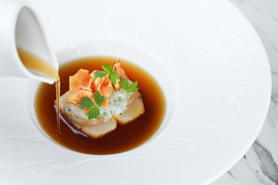 「北海道干貝|菊芋|牛肉澄清湯」 以海陸交織為發想,將法式澄清湯(Consommé)化作感官舞台。底層鋪上香煎北海道干貝,融合菊芋泥與爆炒透抽,層層堆疊出溫潤與鮮甜的基底;上層點綴菊芋脆片,增添脆口口感,透明湯面由白松露油輕輕點綴,香氣隨之在盤中緩緩擴散,層次立體而細膩。澄清湯淋上時,每一口都同時感受到牛肉的自然肉香、海鮮的鮮甜,以及菊芋帶出的蔬果甘甜,三種風味在舌尖交織,彷彿海陸精華在口中悄然對話,呈現味覺與嗅覺的完美平衡。