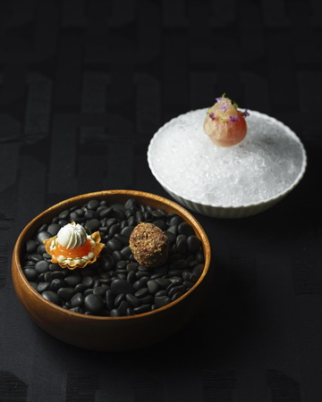 菜單以一系列起伏有致的風味節奏展開,從冬季黑松露與生蠔構成的法式小點開場,延伸至冷熱前菜中鮮味與酸度的層次鋪陳。選用永續鮭魚、松葉蟹、金門野魚與嘉義鵪鶉等在地時令食材,呼應節氣脈動與土地風土。主菜部分則於波士頓龍蝦之間展現理性與感性的張力,以濃郁龍蝦高湯結合海膽與龍蒿油的芳香流動,並以「龍蝦餃」呼應「一蝦兩味」的巧思,構築風味的輕盈變奏,每一道作品皆以醬汁為骨、香氣引線,形構出清晰立體的味覺架構與視覺節奏。