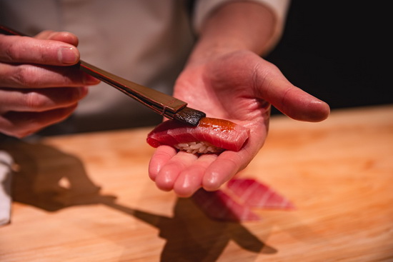 在主廚眼中,板前鮨並非只是將鮨從廚房移至客人眼前製作,而是一種完全不同的料理哲學。板前料理講究的是瞬間完成的完美節奏——從握壓力道、魚料與醋飯的比例,到入口時的溫度與濕度,都必須在客人面前即時完成並立即品嚐,任何細微的差異都可能影響最終風味。