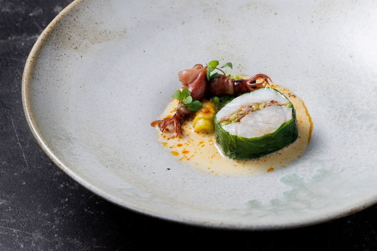 在技術上,Paul Lee 也為自己設定了一個新的料理挑戰。過去在西式料理中,常透過酸與油脂來取得調味平衡,而這次的菜單,他刻意嘗試「一滴酸都不加入」,完全以食材本身的Umami(鮮味)來建立料理的風味架構。 例如開場的生醃牡丹蝦料理,延續潮汕海鮮生醃的概念,以屏東豆豉、蔥薑蒜與醬油調味,呈現清爽又豐富的滋味;魚料理則運用自煉雞油與辛香料搭配紅喉魚和螢烏賊,靈感來自川渝麻辣料理中以油脂解鎖香氣的方式,帶出不同於傳統西式奶油醬汁的東方風味。