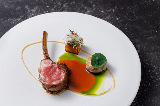 主菜部分選用紐西蘭 Lumina 羊肉,除了羊排,也以羊五花自製臘肉,經鹽、高粱酒醃製、煙燻與風乾後入菜,再搭配大蒜Purée、黑蒜與青花椒油等不同蒜香元素,並與層層堆疊的馬鈴薯千層結合,呈現濃郁而立體的風味結構。