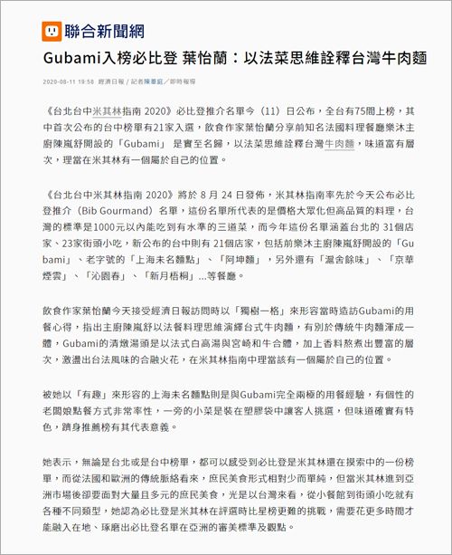 針對二○二○台北台中米其林指南榜單,葉怡蘭表示,米其林評鑑時常會從法式料理角度、審美觀為出發點,今年卅間星級餐廳中有十間法式餐廳,趨於保守。葉怡蘭另指出,Forchetta的主廚Max多年前就在西式料理中加入台灣食材和語彙,是此屆一大亮點。另外新晉一星的「明壽司」提供「相對親民價」選擇,奪星後能否維持……