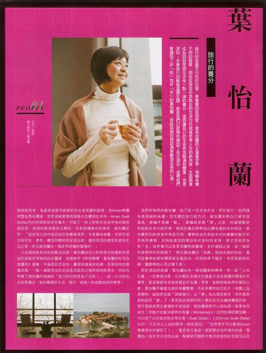 關於旅行的方式,葉怡蘭笑稱自己總是很偏執,要嘛不是極「動」、要嘛就是極「靜」之旅,所謂極動便和她的老本行脫不開,那就是在遍及鄉野或山腰各處的食材探訪,至於極靜之旅,則是以「旅館」做為出發的目的,好好的停下腳步,享受孤僻與安靜,讓喧嘩的心可以慢下來……