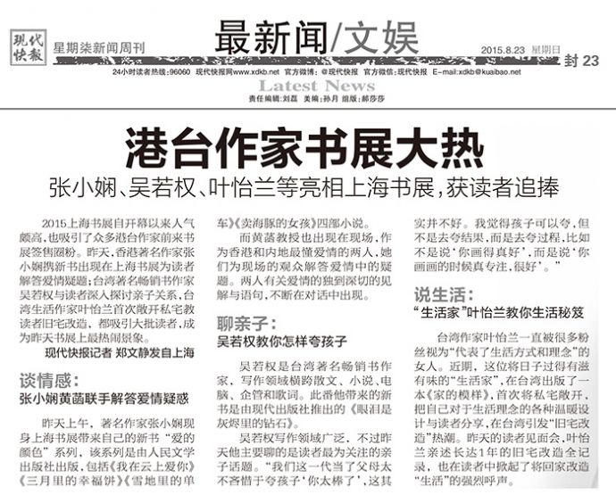 2015上海書展自開幕以來人氣頗高,也吸引了眾多港臺作家前來書展簽售圈粉。昨天,台灣生活作家葉怡蘭首次敞開私宅教讀者舊宅改造,吸引大批讀者,成為昨天書展上的熱鬧景象……